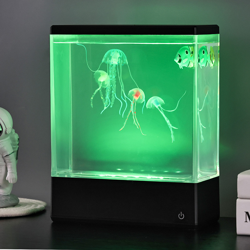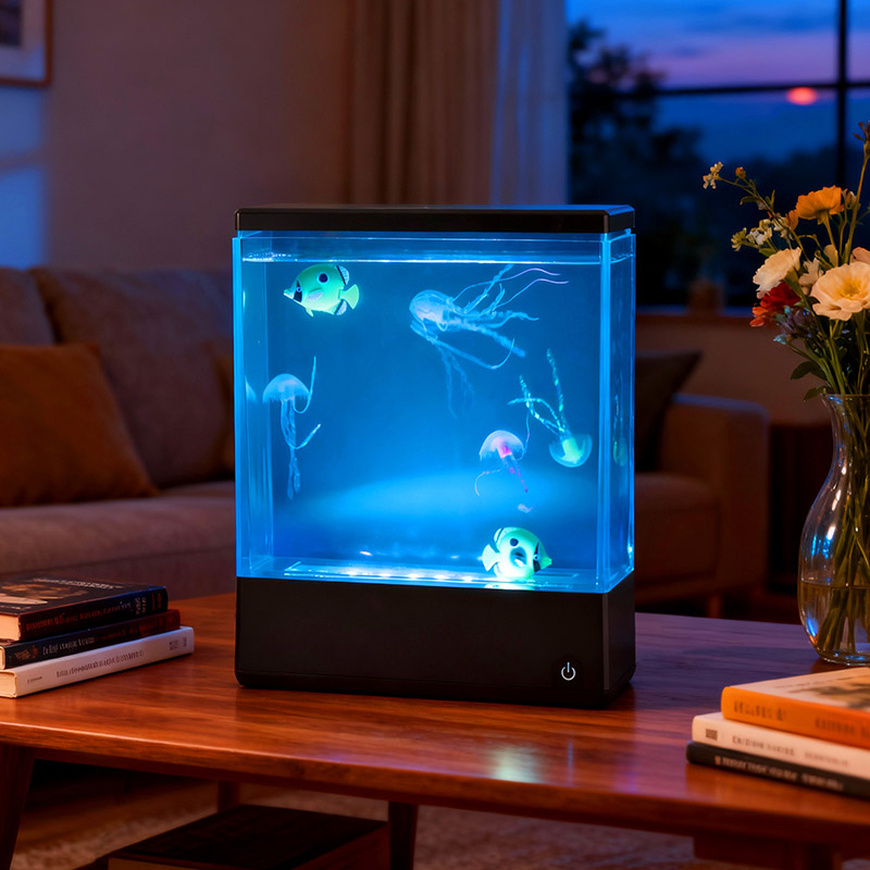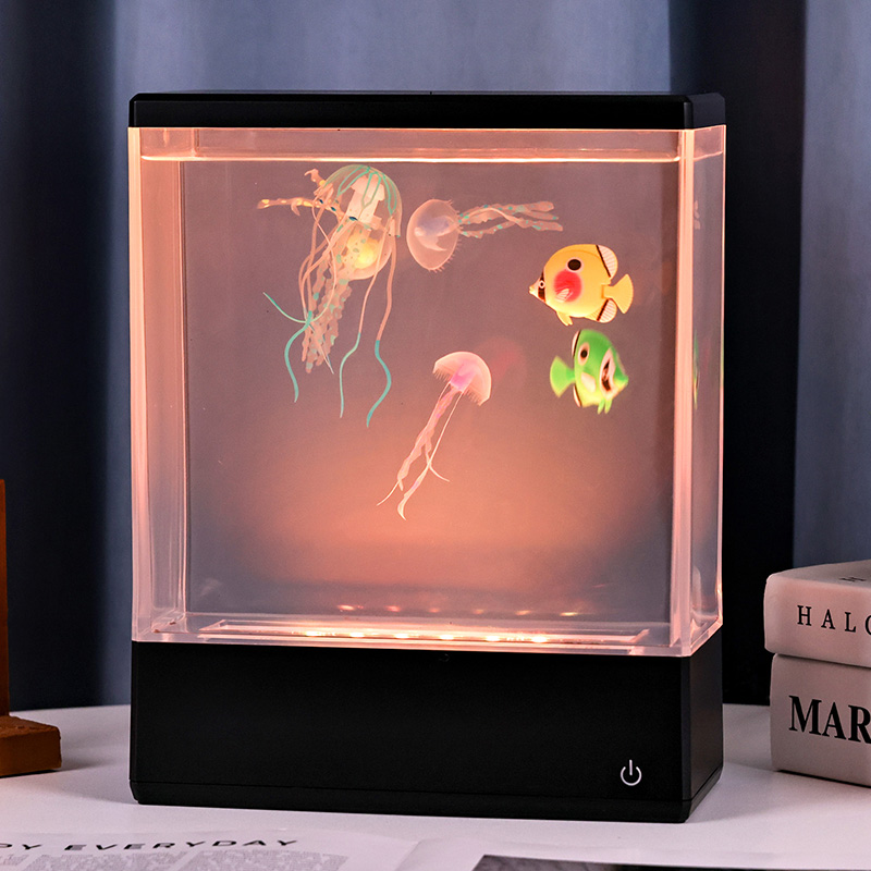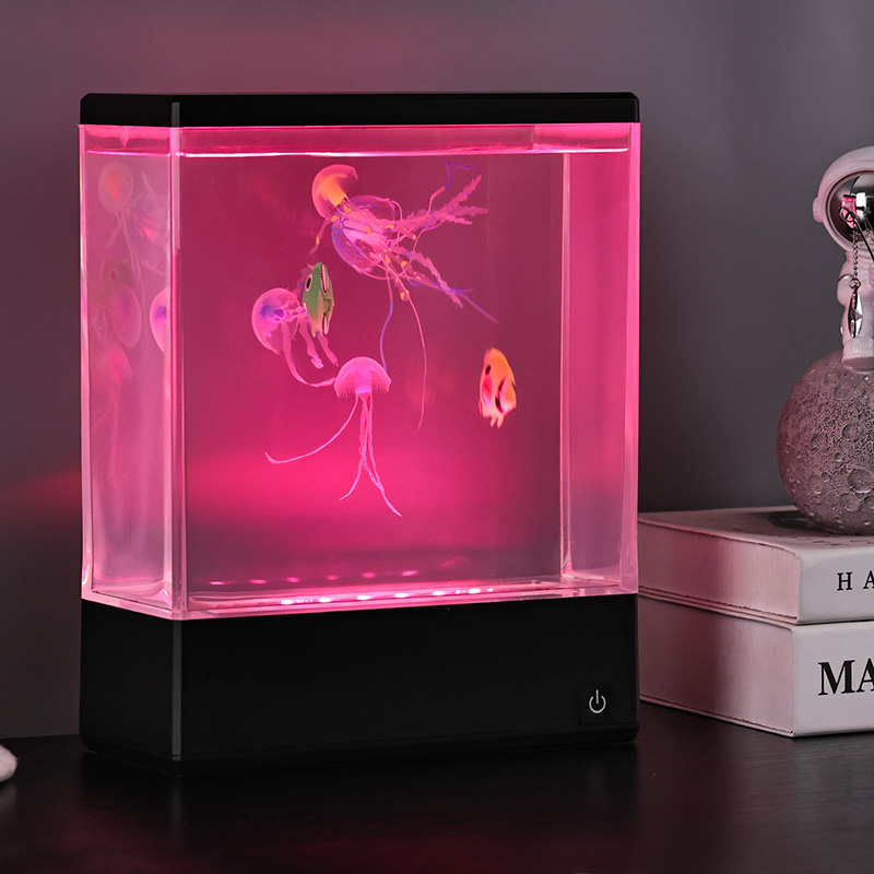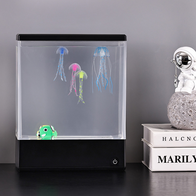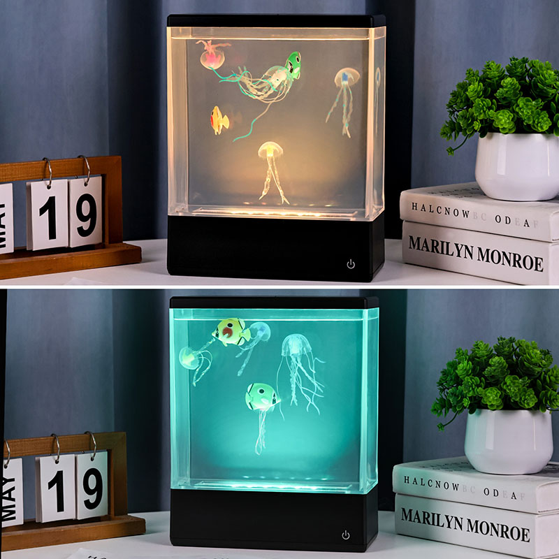 At first glance, the lamp’s sleek, modern rectangular design resembles a miniature water-filled fish tank, but instead of water and live creatures, it houses two lifelike, silicone jellyfish that float and gently undulate in a continuous, graceful dance. Powered by a silent internal circulation system