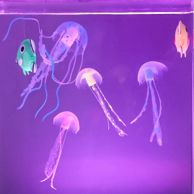 and soft air currents, the jellyfish drift realistically through the illuminated chamber, creating a hypnotic visual experience that instantly soothes the mind and reduces stress.