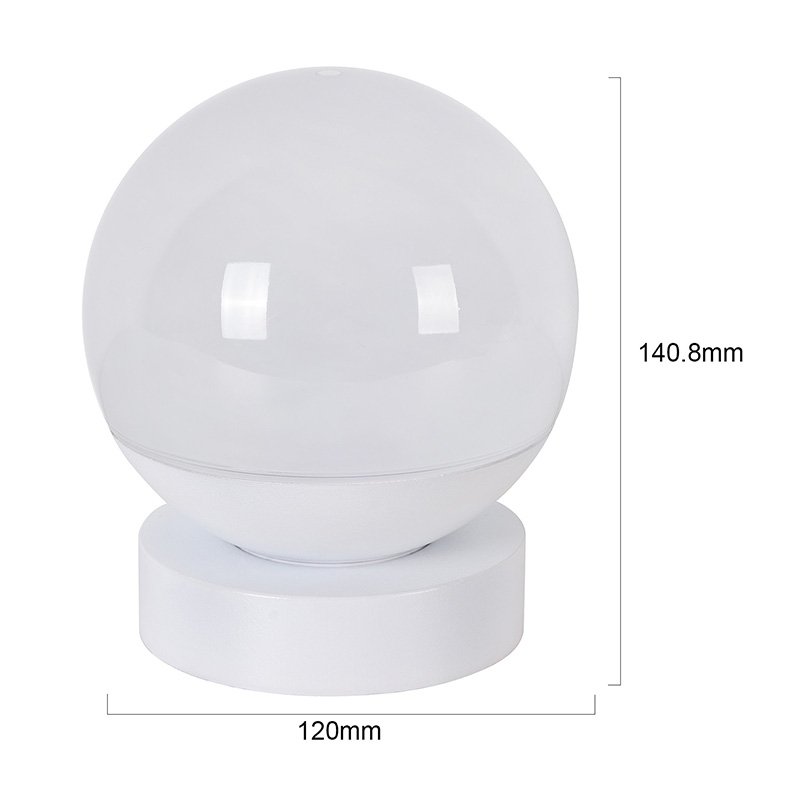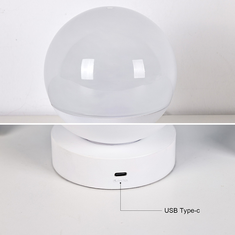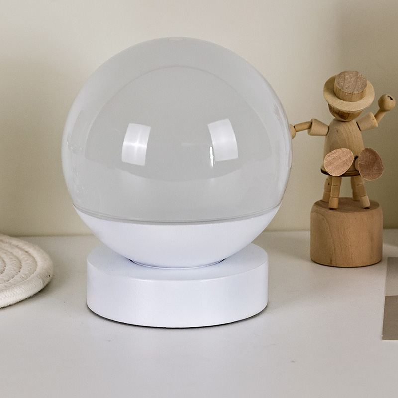 The overall design features a rounded sphere, with the upper half made of translucent frosted material that emits soft, gentle light. The lower half consists of a white base for stable support, featuring clean and smooth lines. Its compact size