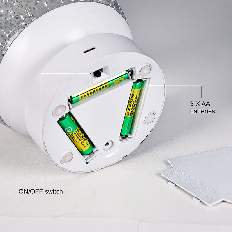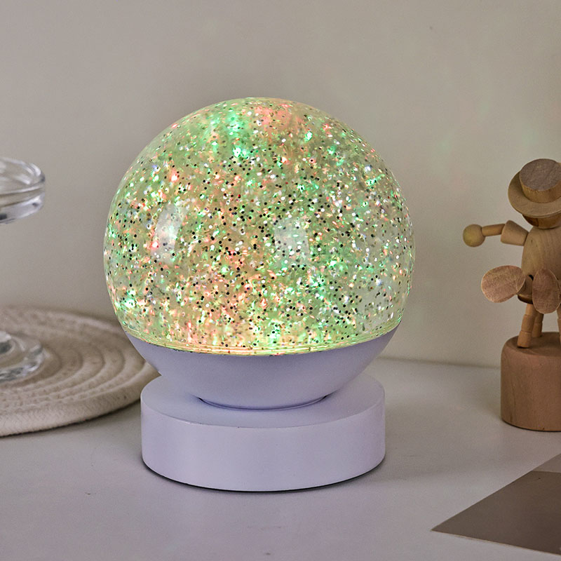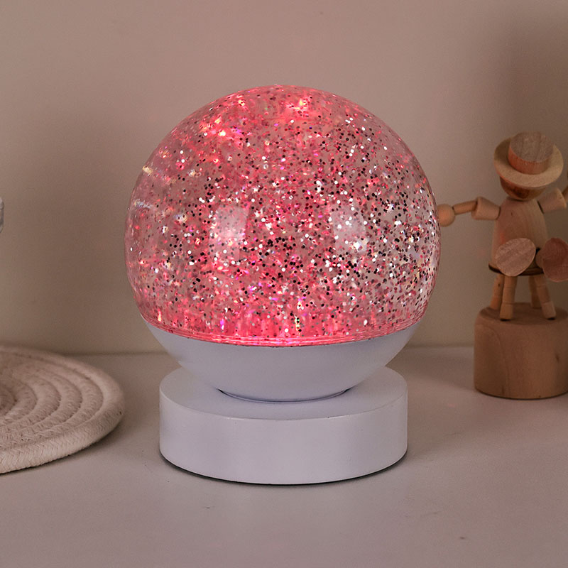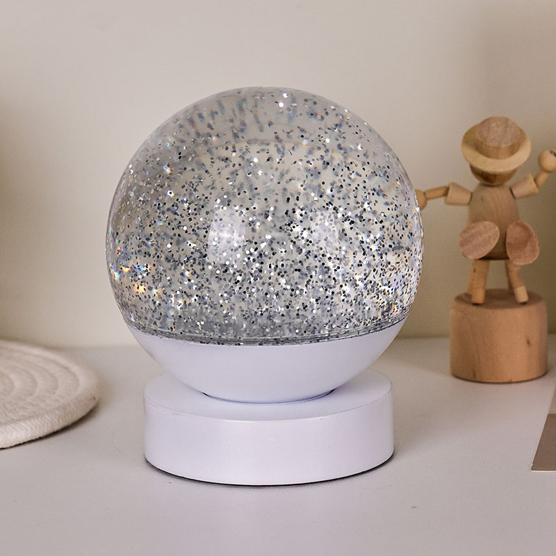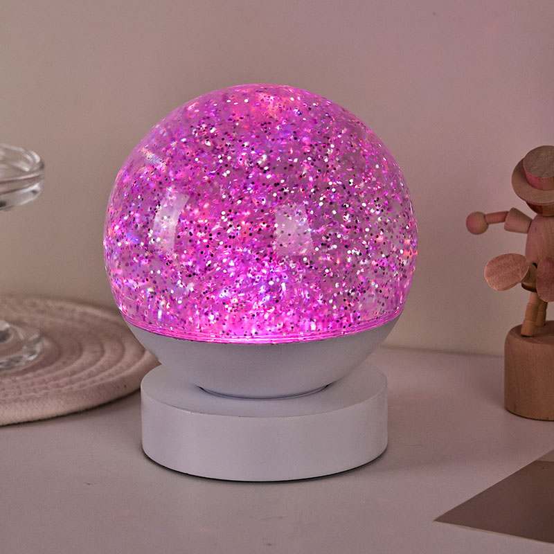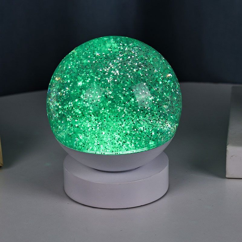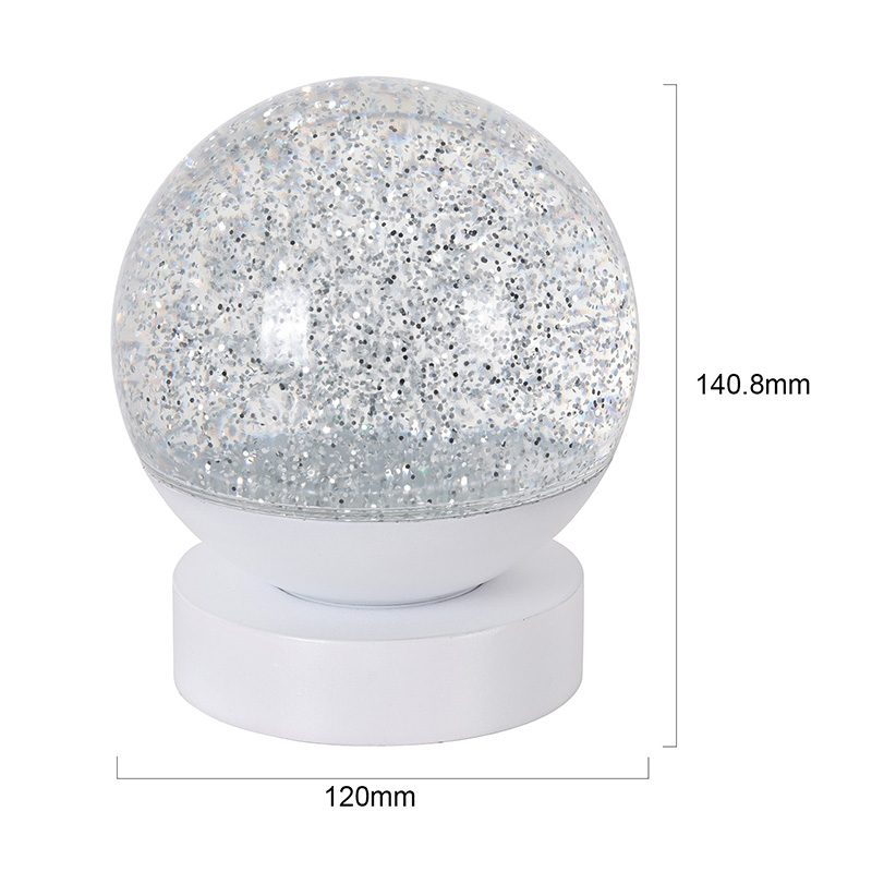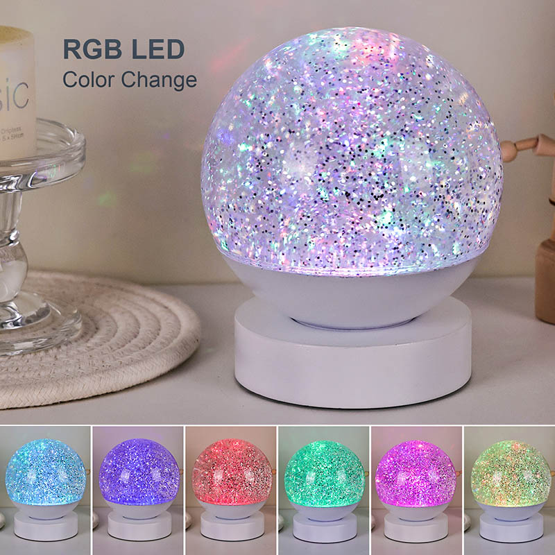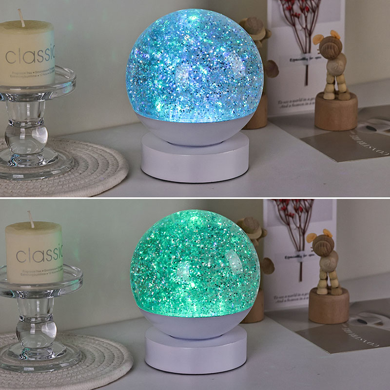 Led RGB Glitter Decor Lamp is made from high-quality acrylic material, featuring a translucent sphere with excellent light transmission. The base is crafted from eco-friendly ABS plastic, ensuring stability, durability, and safety without toxic substances. It operates on three built-in AAA batteries (batteries sold separately), eliminating the need for a power outlet and offering convenient use. Perfect for placement by the bed, desk, or in a child's toy corner. With a simple touch switch, the light can be easily turned on or off, making it user-friendly even for children to operate independently.