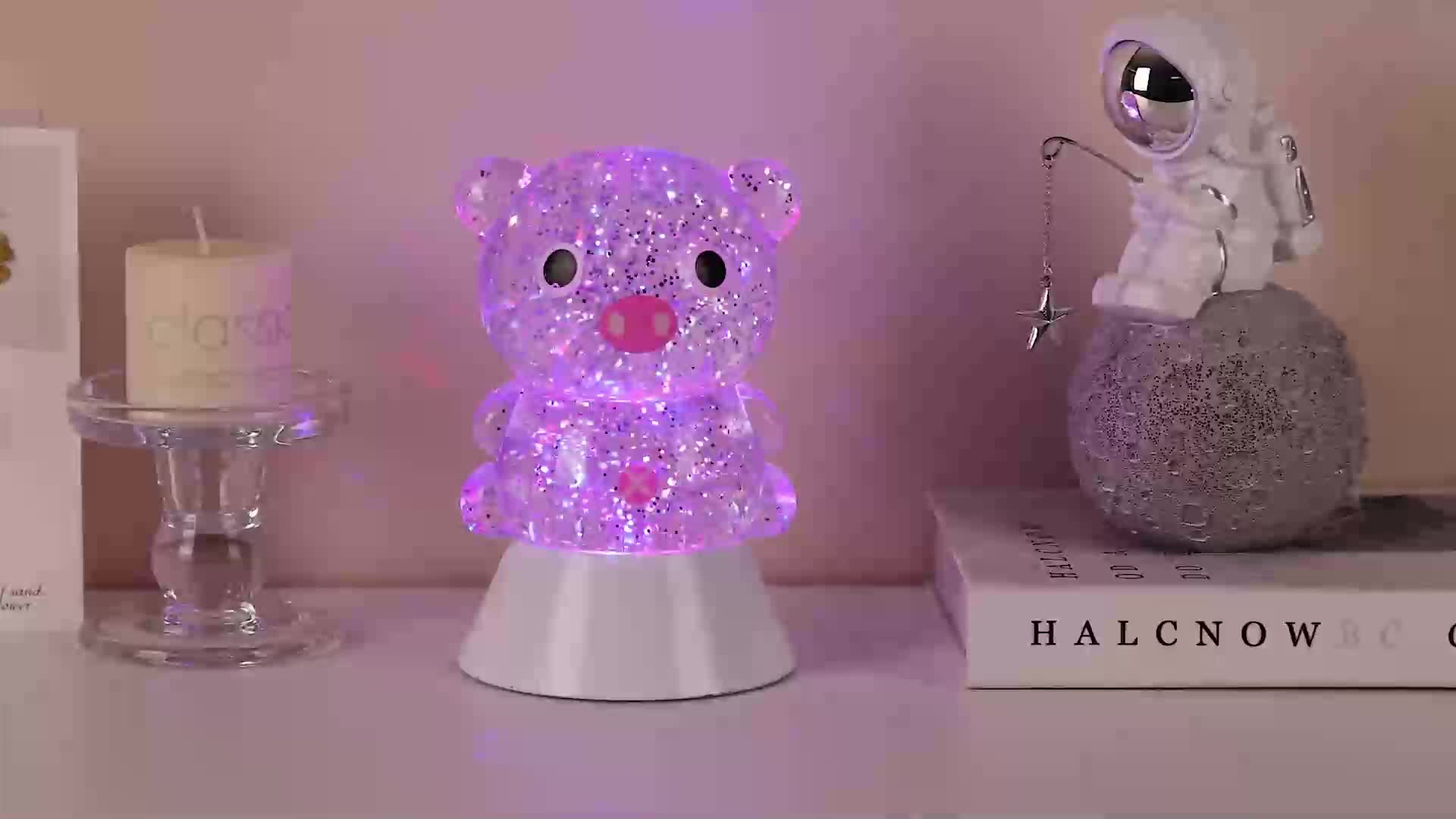 The overall design features a cute and adorable piggy image, with its round and plump contours paired with large eyes, a pink snout, and adorable little ears, instantly capturing the hearts of both adults and children. The transparent resin shell is filled with sparkling colored sequins and special liquid, which gently flows with the liquid when the lights are turned on, creating a dreamy visual effect like a starry river flowing within the piggy body. The light colors automatically cycle through, shifting from soft pink and dreamy purple to fresh blue and green, continuously changing into a rainbow of colors that create a peaceful yet magical atmosphere, as if bringing the fairy tale world into reality.