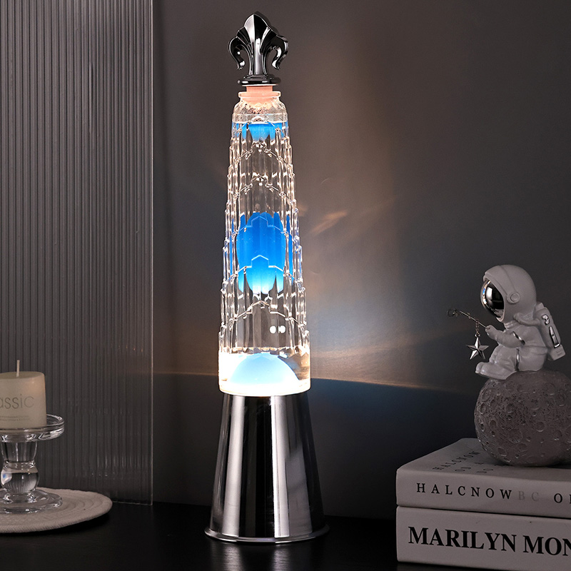 Tower shade lava lamp table lamp features a classic tower shaped design, with exquisite black metal decorations embedded at the top, simple yet noble. Inside the transparent glass bottle, blue wax is present